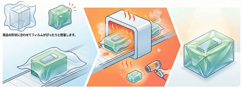 シュリンク包装は熱収縮フィルムで対象を包み、加熱することでフィルムを収縮させます。フィルムが対象の形状にぴったりと張り付けばシュリンク包装は完了です。ただし、最後に検査を行って、混入物やシワなどが発生していないか確認を行います。